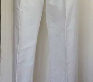 Pantalon blanc COURREGES coton satin de coton blanc tour de taille réglable par pattes cotés Tour de taille 72 cm Hauteur 105 cm tour bas de jambe 40 cm 1 poche siglée bouto