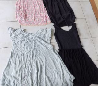 lot de 9 vêtements comprenant 2 nuisettes (une noire et une rose à fleur), 2 robes (1 noire et 1 vert kaki pâle), 2 gilets (1 gris foncé à capuche et 1 rose à manches gris clair),