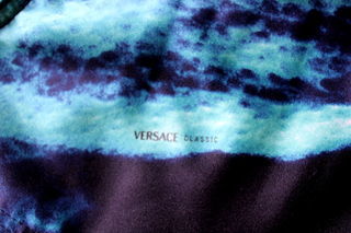 Pantalon zèbre bleu VERSACE T.29 IT soit 36/38 max polyester H 102 cm Tour de taille 68 cm 5 poches bouton taille et rivets siglés VERSACE tissu siglé VERSACE TBE Envoi po