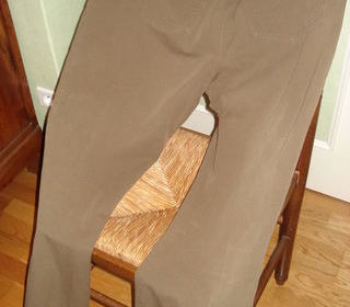 pantalon 100 % polyester 42/44 élastique et cordon à la taille marron avec motifs pour récupération du tissus ou si on souhaite le recoudre comme on veut contact : abc2020