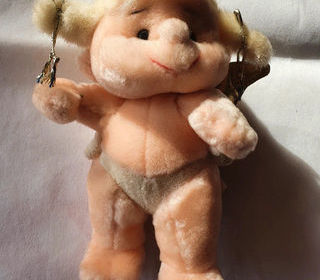 peluche ours puffalump toile de parachute bleu turquoise et blanc noeud rose sur la tete yeux plastique 30 cm marque playful tres bon etat envoi rapide ref 440