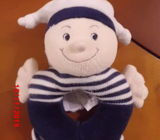 peluche marin hochet ecru et bleu marine en velours gratte grelot a l'interieur 16 cm marque jollybaby tres bon etat envoi rapide ref 402