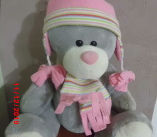 peluche ours gris en velours gratte avec son bonnet et echarpe rose raye multicolore 25 cm en position assis marque lou'ann company tres bon etat envoi rapide ref 405