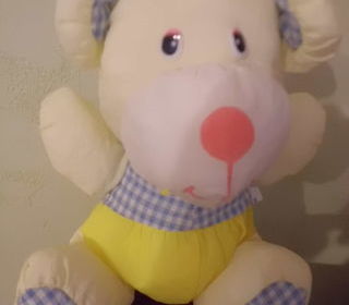 peluche ours ou souris puffalump jaune et tissu vichy bleu 28 cm ou 24 cm en position assis idem a la photo tres bon etat envoi rapide ref 432