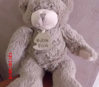 peluche ours marron glacé qui tire sur le gris museau et bouts des pattes beige en velours gratte poil mi long 22 cm marque histoire d'ours tres bon etat envoi rapide ref 314