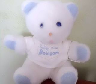 peluche ours blanc et bleu ciel yeux bleu avec tee shirt blanc imprime baby ours boulgom 23 cm en pôsition assis marque boulgom tres bon etat- envoi rapide ref 429