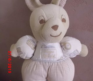 peluche lapin bleu corps tissu blanc imprime ourson et etoiles yeux marron nez rose pouet pouet a l'interieur 26 cm avec les oreilles marque boulgom tres bon etat envoi rapide ref