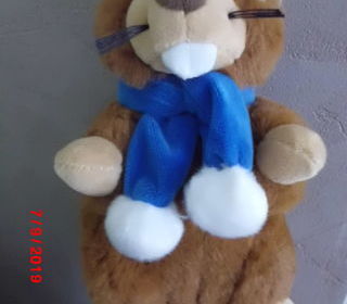 peluche marmotte marron et beige avec son cache nez bleu a ponpons blanc autour du cou 24 cm marque sandy tres bon etat envoi rapide ref 390