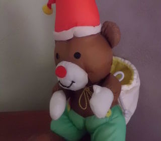 peluche ours marron vert et rouge puffalump toile de parachute avec sa hotte dans le dos 25 cm en position assis marque fizzy tres bon etat envoi rapide ref 433