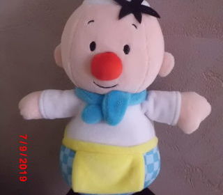 peluche clown bumba en velours gratte blanc et bleu brode gateau sur le bonnet et dans le dos 24 cm tres bon etat sauf etiquette coupee envoi rapide ref 390