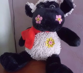 peluche mouton noir et blanc en velours gratte fleur sur le museau et la poitrine echarpe rouge autour du cou 28 cm marque cp tres bon etat envoi rapide ref 412
