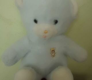 peluche ours bleu ciel interieur des oreilles bouts des pattes et museau blanc yeux plastique noir brode ours beige sur la poitrine 30 cm marque boulgom tres bon etat envoi rapide