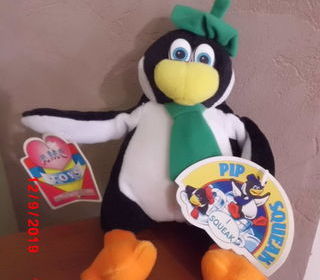 peluche pingouin blanc et noir bonnet et echarpe verte pouet pouet a l'interieur en velours gratte 20 cm marque amc toys pip squeak tres bon etat envoi rapide ref 392