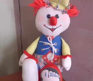 peluche clown d'activite vintage en tissu grelot dans le bonnet nez et bouts des pieds tissu satin rouge 45 cm tres bon etat sauf etiquette effacee envoi rapide ref 422