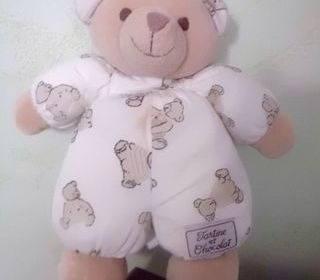 peluche doudou ours beige en velours gratte et tissu ecru imprime ourson grelot a l'interieur 20 cm marque tartine et chocolat tres bon etat envoi rapide ref 436