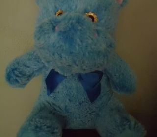 peluche hippopotame bleu yeux brillant or 26 cm en position assis marque max & sax tres bon etat envoi rapide ref 434