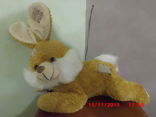 peluche lapin marron et blanc allonge poil bouclé pieces de tissu velours beige sur le dos et l'oreille 35 cm en position allonge tres bon etat envoi rapide ref 402
