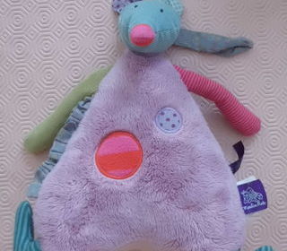 peluche souris vieux rose et tissu velours et tissu jersey raye 25 cm corps rembourre marque moulin roty collection les jolis pas beaux bon etat envoi rapide ref 430