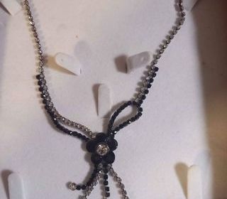 Collier réglable femme Matières métal et strass Forme fleur Couleurs noir et brillant En très bon état Dimensions approximative collier 41cm de long - Pendentif 8cm de lon