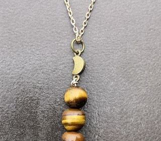 Je vends ce pendentif Croissant de lune et Etoile et 3 perles ?il de Tigre Naturelles et petit pompon noir Le pendentif mesure 8,5 cm La chaine acier couleur Or Rose avec fer