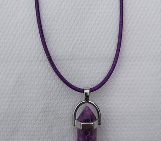 Je vends le pendule en Améthyste naturelle de très belle qualité L'Améthyste est montée en pendentif dans une cage argentée La longueur du pendentif suspendu est de 4,5 cm