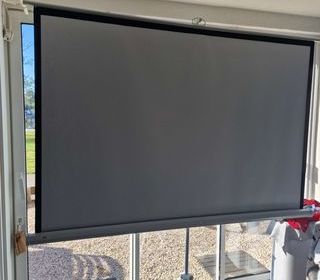 Écran de projection de couleur blanc avec bordure noire, fixé au plafond et se déroulant verticalement.