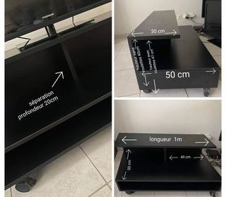 Meuble TV en bois de couleur noir. possibilite de passer les câbles au dos du meuble .Meuble posé sur roulettes .longueur du meuble 1m hauteur 47 cm .Meuble ayant servi ,quelques m