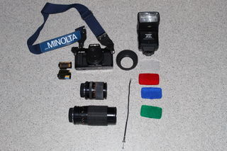 Appareil photo argentique MINOLTA X300, avec sangle MINOLTA. 1 pare soleil- 1 déclencheur souple flexible. 1 objectif zoom Tokura 3,5 - 70 mm 1 objectif zoom Tokura 80 - 200