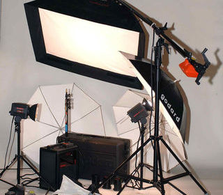 Lot d'éclairage GODARD en état de marche: Générateur 3200 joules,générateur 400 joules, 2 torches t2,boites a lumière 80X110 et 30X40 ,3Xparapluies blancs,1 girafe Manfrotto (2 m),