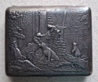 Étui à cigarettes vintage avec l'intrigue "Matin dans une forêt de pins" Usine "Métallodetal" URSS. Laiton - argenté, cabochon rubis, années 50. Livraison depuis la Pologne par co