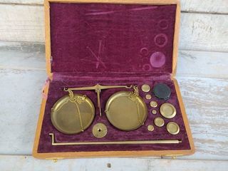 Ancienne Balance Trébuchet de Bijoutier Horloger Pharmacie Format du coffret 26cm x 15cm x 3cm État : Bon état, il manque la pince et l'anneau en laiton qui permet l'accroc