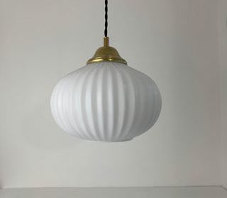 ENVOI POSSIBLE Achat sécurisé sur notre site internet nikel-forms Adresse sur simple demande Suspension en opaline cannelée, laiton et bois. Très belle lumière. Quelques tra