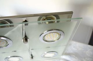 Plafonnier bleu, avec 3 spots orientables, alimentation ampoules 50 W maximum par spot. Fourni avec 3 ampoules 50 W. Il est en très bon état, emballage d'origine.