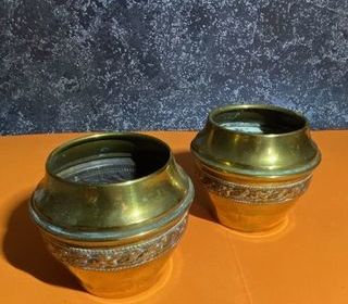 Paire de petits pots décoratifs Jolie paire de petits pots anciens en cuivre, laiton, multi usages et très décoratifs Traces d'usage qui font le charme de l'objet Thèmes