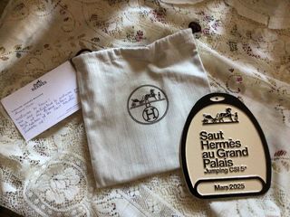 Originale plaque saut Hermès mars 2025 au grand palais en très bon état avec son tissu authentique Hermès et carte