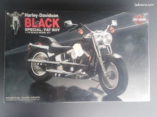 Maquette IMAI Harley-Davidson FLSTF Black Fat Boy à l'échelle 1/12ème B-2423. Le kit est moulé en couleur, a des pièces plaquées fines, des roues mobiles et des pneus en caoutchouc