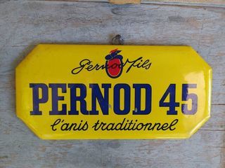 Rare Plaque Glacoide Pernod 45 / Pastis Anis Longueur 19,3cm, hauteur 9,5cm. Bel état, un minuscule impact (non perçant) et deux taches (colle ou peinture ?)