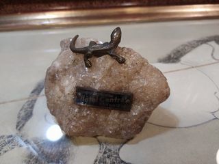 Ancien Souvenir des Grottes Hôtel Central Han sur Lesse /Lézard sur Pierre Minéraux Début XXème Matière : Pierre minéral, lézard et plaque bronze ou laiton. Hauteur 8cm, long