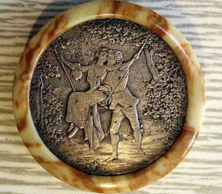 Boite pilulier ou poudrier esprit XVIII eme siècle bakélite façon marbre plaque en métal argenté gravée scène galante la boite ferme en se vissant, très étanche diamètre 6 cm h