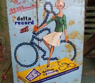 Rare Plaque Tôle Publicitaire Sedis Delta Record Chaine de Vélo Bicyclette Cycles Hauteur 40cm, largeur 30cm. Etat : Anciennes pliures, usure et traces de peinture (voir phot