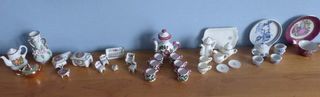 MINIATURES A COLLECTIONNER (c2) : - 1 ASSIETTE 1 TASSE, ton vieux rose, décors romantique, assiette diamètre 9 cm, tasse diamètre 4 cm hauteur 3 cm - SERVICE A THÉ motif bleu :