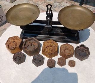 balance romaine ancienne avec plateaux et poids rare dans cet état