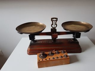 2 plateaux en cuivre de 18 cm de diamètre poids maximun 5kgs à peser longueur de l objet 44,5 cm longueur du socle 37 cm et largeur 10 cm boite de poids