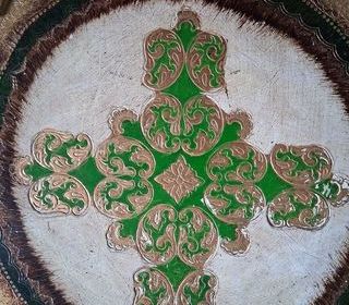Coffret en bois entièrement recouvert de daim, à l'intérieur comme à l'extérieur. Travail entièrement fait à la main, artisanat de Côte d'Ivoire, d'où les masques et dessins qui y