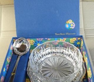 Bel ensemble du siècle dernier coupe saladier aspect cristal + louche + plateau en inox dans leur coffret d'origine. Saladier : diamètre 21cm. Plateau : diamètre 24cm. Bien prat