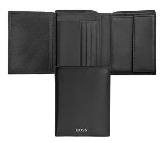 Ce portefeuille vertical avec rabat et pochette à monnaie est réalisé en cuir lisse noir de première qualité soigneusement sélectionné. Il est orné d'une luxueuse plaque de signatu
