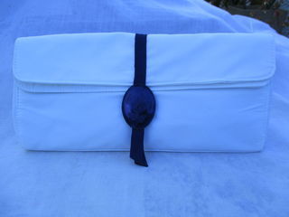 une belle pochette de soirée des années 50, couleur écrue, fermoir doré par pression, anse en chaînette dorée. Intérieur, tissus nylon marron foncé. Une grande pochette et une peti