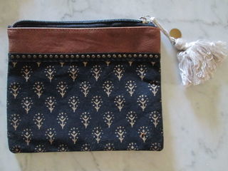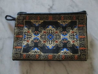 Petite pochette en tissu avec motifs de couleur dorée, bleu, noire, orange, marron Dimensions : 14,5 x 9,5 cm Fermeture éclair Neuve, jamais utilisée IMPORTANT : - A ve