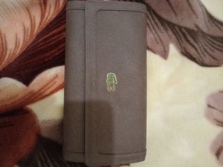 Portefeuille Lacoste 10cm de large, 20cm de.long . Rabat à presser, et six pochettes , pour cartes de crédit et visite , deux longues pour billets, de chaque côté, et une centrale