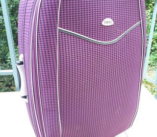 Excellent état et propre En tissu parme et noir Sur roulettes avec double poignée dont une poignée télescopique Fermeture à zip - Porte étiquette Double Pochette à zip devant